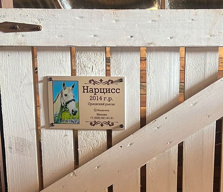 Табличка для лошади изготавливается на основе из пластика ПВХ (толщина 4 мм), композита (толщина 3 мм) или оцинкованного металла (толщина 0.7 мм).