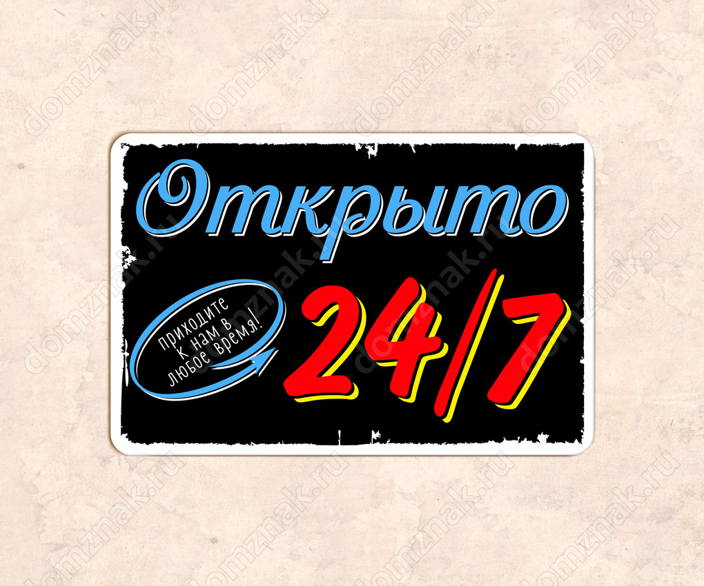 Табличка «Открыто 24/7 приходите к нам в любое время»